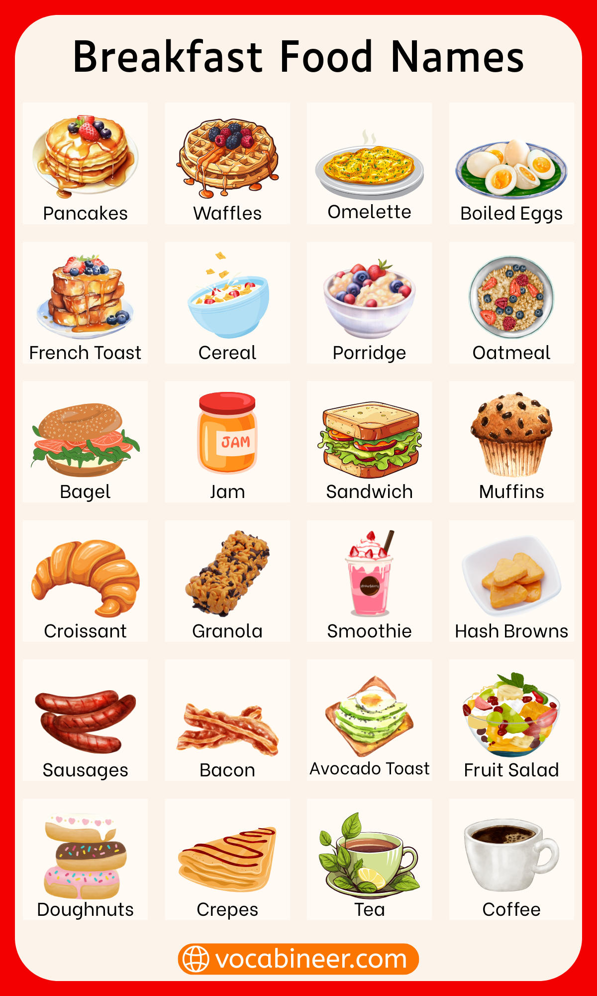 Breakfast food items names in English include many foods people eat in the morning, such as eggs, toast, oatmeal, cereal, yogurt, fruit, pancakes, waffles, and breakfast sandwiches. These foods can be grouped by type, food family, and serving style, which makes the topic easier to understand. Learning these breakfast food items helps readers talk about morning meals more naturally at home, in class, on menus, and in daily conversation.