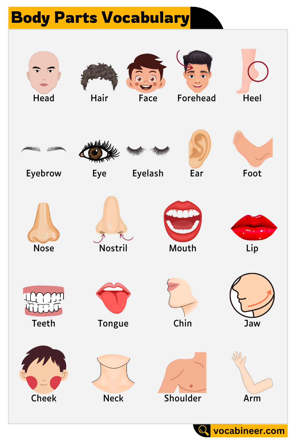 When teaching kids, it’s helpful to show pictures of body parts. This builds vocabulary and helps them understand location and use. Common parts to teach include: