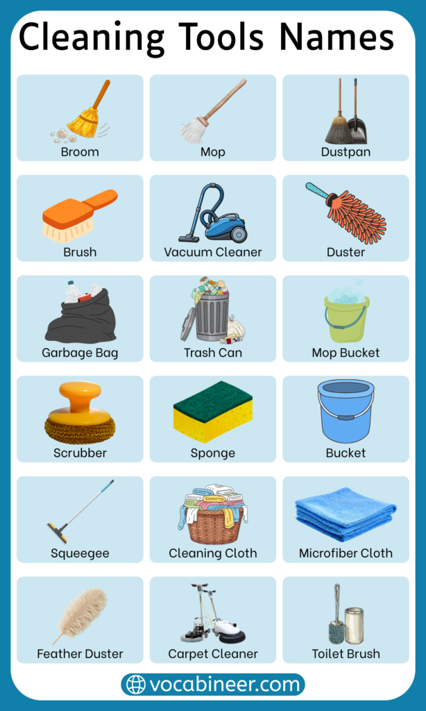 In this post, readers will learn cleaning tools names with pictures and simple explanations. Knowing these names helps follow cleaning-related descriptions and understand tools mentioned in school lessons, work settings, and everyday reading.