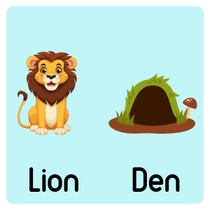 A den is a hidden or sheltered home for animals like lions, wolves, and foxes.