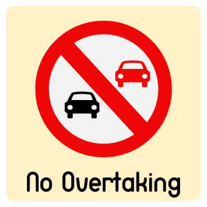 - No Overtaking – Informs drivers that overtaking other vehicles is strictly prohibited in this area.