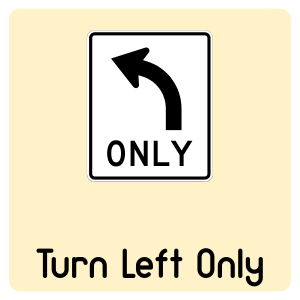 - Turn Left Only – Instructs drivers that only a left turn is permitted at the intersection ahead.